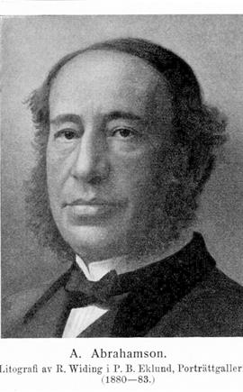 1. August Abrahamson, f. 29 dec. 1817 i Karlskrona, d 6 maj 1898 på Nääs. Föräldrar: köpmannen i Karlskrona Aron Abramson och Fredrique Schlesinger. Måste på grund av faderns obestånd och tidiga död (1829). redan som barn försörja sig själv; erhöll 1832 anställning i affär i Göteborg; grundade 1840 i eget namn en grosshandelsfirma i korta varor, vilken snart kom att räknas bland stadens och ...