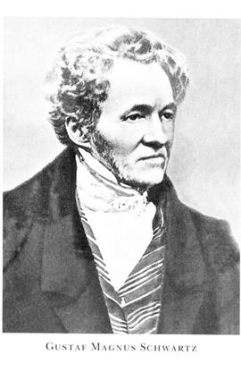 Schwartz, Gustaf Magnus, f 21 aug 1783 i Hfors, d 25 mars 1858 i Sthlm, Finska. Föräldrar: råd- o handelsmannen Petter S o Margareta Wilhelmina Philp. Inskr vid Åbo akad 11 mars 99, bergsex där 12 juni 01, auskultant i Bergskoll 14 juli 01, kemist vid Rörstrands kemiska lab i Sthlm 05, kanslist i Kontrollverket 21 maj 05, notaries titel där 22 dec 06, lär vid VA:s teknolog undervisn:anstalt ...